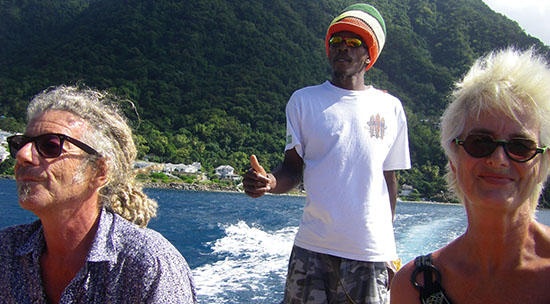 Micheline et Jean-François ont été cueillis comme des fruits bien mûrs et dorés sur la plage de Rodney Bay après un séjour à l’hôtel. Nous avons fait cap sur Soufrière pour le grande beauté du paysage bien sûr mais aussi pour faire le plein d’eau potable. Les pluies abondantes du 24 décembre, pas moins de 88 cm d’eau en 24 heures, ont tout raflé et 6 jours plus tard, les systèmes d’eau des marinas du nord (IGY et Marigot) sont toujours en panne. Grâce à Michel notre boatboy (un autre frère de Capitaine Bob), nous avons eu exceptionnellement accès au quai de Soufrière et à son boyau d’eau. Je n’avais jamais pensé qu’un jour Bleu Marie s’y amarrerait.