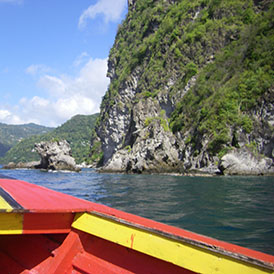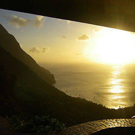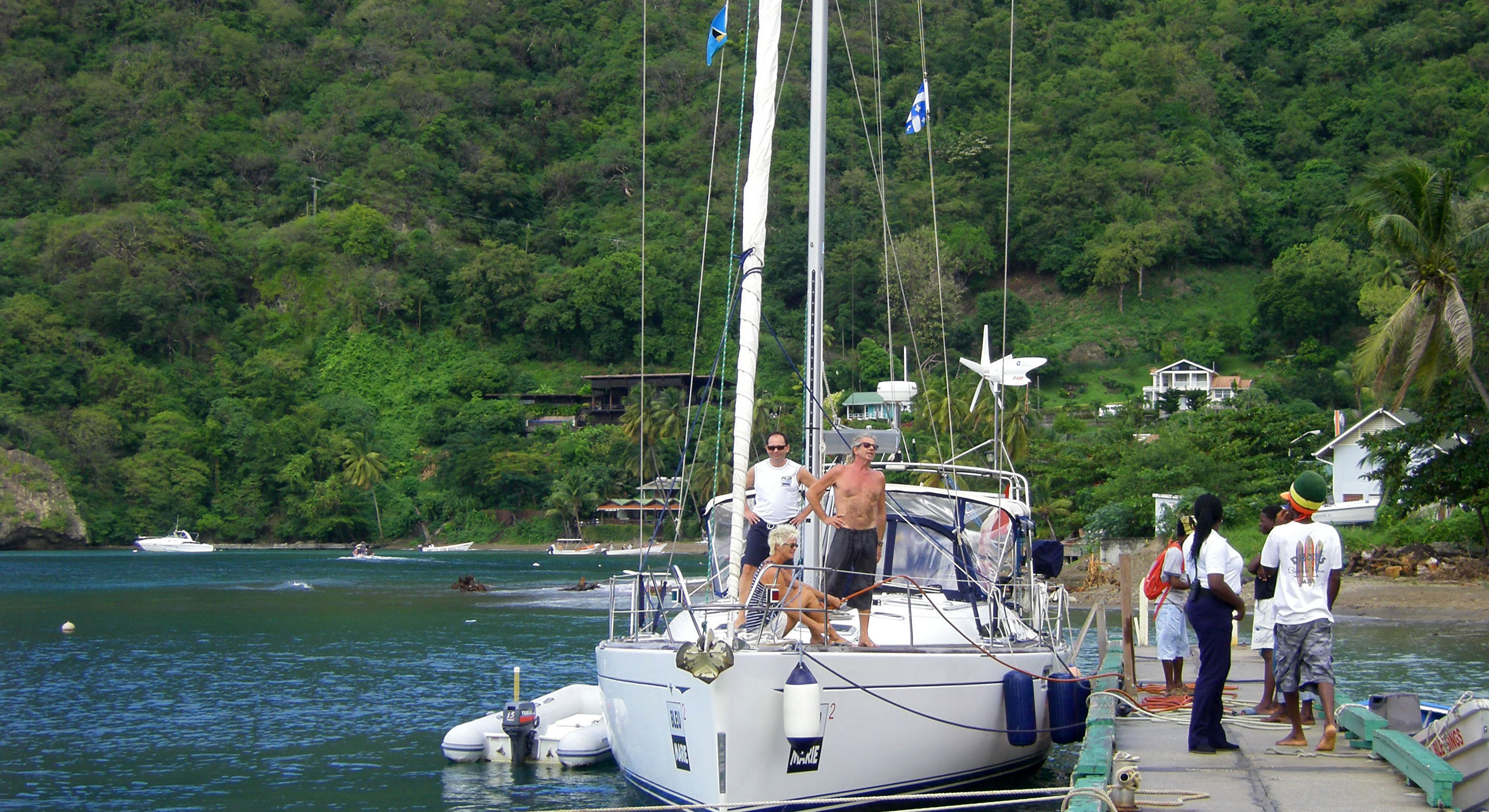 Micheline et Jean-François ont été cueillis comme des fruits bien mûrs et dorés sur la plage de Rodney Bay après un séjour à l’hôtel. Nous avons fait cap sur Soufrière pour le grande beauté du paysage bien sûr mais aussi pour faire le plein d’eau potable. Les pluies abondantes du 24 décembre, pas moins de 88 cm d’eau en 24 heures, ont tout raflé et 6 jours plus tard, les systèmes d’eau des marinas du nord (IGY et Marigot) sont toujours en panne. Grâce à Michel notre boatboy (un autre frère de Capitaine Bob), nous avons eu exceptionnellement accès au quai de Soufrière et à son boyau d’eau. Je n’avais jamais pensé qu’un jour Bleu Marie s’y amarrerait.