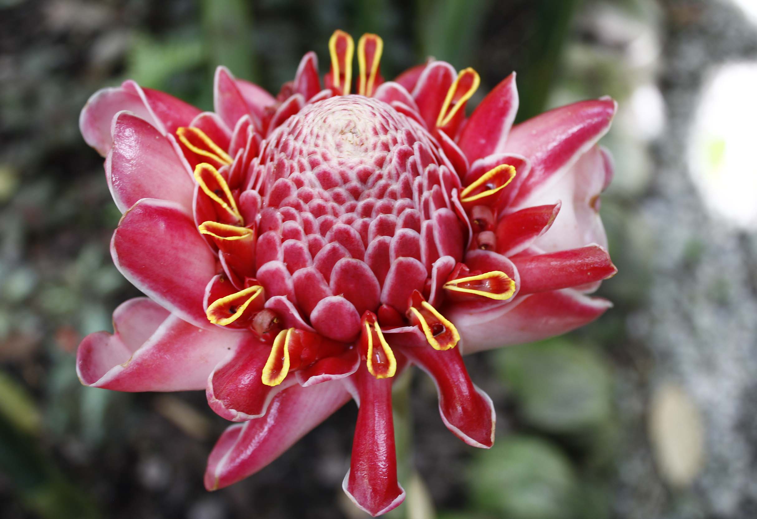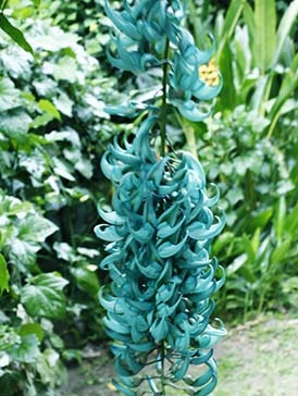 Une vigne de jade, vue au jardin botanique de Soufrière, elle est importée de la Phillipine en 1854. À gauche, une rose de porcelaine.
