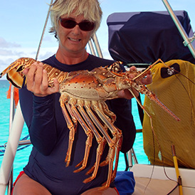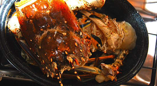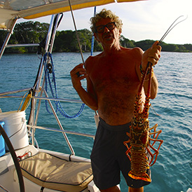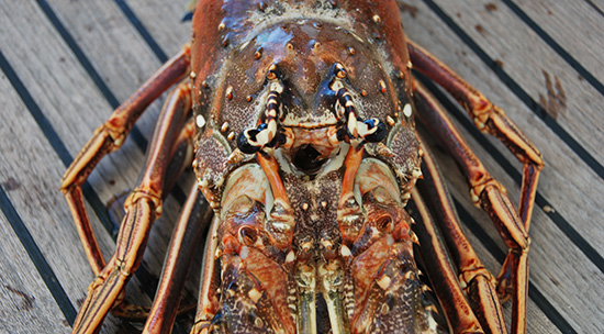 Aux yeux avertis, elles dénoncent la langouste se terrant dans son trou. La chasse a été ré-ouverte. Nous avons pris deux beaux spécimens laissant les petites pour notre prochain passage. Jean-Pierre n’a pas perdu la main (regardez le trou bien aligné entre les deux yeux de la langouste) et moi, ma place pour les débusquer. Des grosses bêtes avec plein de chair partout, partout. L’une, dans ses pattes et ses antennes, nous a donné 350 grammes de tendres délices.