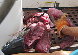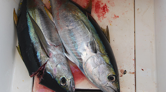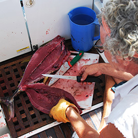 En route vers Bonaire, nous avons traversé un grand banc de thons à queue jaune. Oui, oui! Le thon à chair rouge, celui qui fond dans la bouche mangé tout cru avec un filet d’huile d’olive, une des meilleures chairs que l’on puisse pêché. Veinards, nous en avons pris deux en simultané, un sur chaque ligne. 26 pouces-10 livres x 2. Chacun notre poisson, Jean-Pierre et moi avons pratiqué notre technique de dépeçage. Le mer était calme, nous les avons fileté en route. Au final, nous avons mis au frais 10 livres de filet plus que frais. Il en faut moins pour être Maître poissonnier chez Métro!