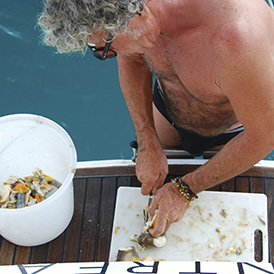 Poissons, coquillages et crustacés, nous avons chassés. Ils ont été l’occasion de concocter des plats aussi variés que délicieux, un véritable voyage gustatif… Aline et Luc, avec qui nous naviguons depuis Blanquilla, adorent faire la cuisine, essayer de nouveaux trucs et se délecter. Nous avons accommoder nos cadeaux de la mer: de sel, de jus de citron vert, de sauce pimentée, de vodka, de beurre blanc, à la thermidor, en tartare, fumé à l’érable ou au mesquite, en suhis, en gravlax, en ceviche, à la plancha et ce sans, aucun tralala ou presque… Les Océanas aiment bien soigné la présentation de leurs plats et faire un régal autant pour les papilles que pour les yeux. Vive la pêche, les amis et les fonds poissonneux!