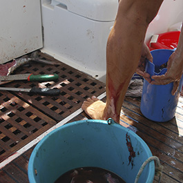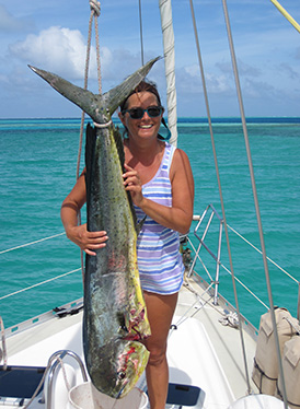La réputation de grande pêcheuse d’Aline n’est plus à faire. Voilà quatre ans, que nous entendons Océana 1 sur le réseau du capitaine, nous annoncer ses pêches miraculeuses. Qui de mieux qu’eux pouvaient nous apprendre une fois pour toute à fileter la bête. Aline et sa dorade coryphène 56 pouces-30 livres, chopée en entrant aux Aves de Barlovento (îles des oiseaux au vent).