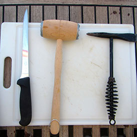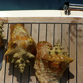 Ici, nous avons assez facilement trouver des lambis. Alors, on s’y est remis: salade crue, conch chowder, acras de lambi. Il nous reste encore quelques bonnes recettes à essayer. Nous sommes maintenant très bien outiller pour sortir la bête de sa coquille: pic, marteau attendrisseur et couteau à lame flexible.