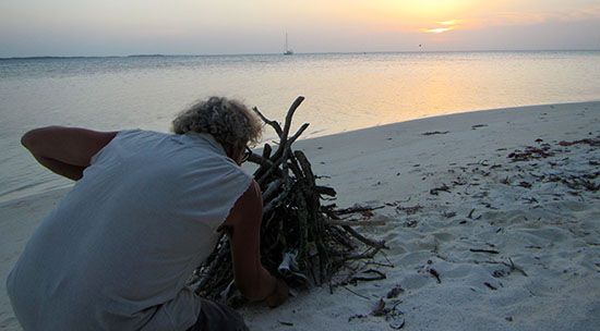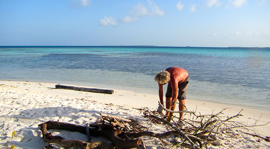 Après quelques jours, nous nous sommes dirigés vers le sud-ouest. Premier arrêt, sur le banc près de Boca Del Medio, derrière la barrière de corail. Ici, l’ouverture sur l’océan nous happe, on se sent vulnérable et petit tant le paysage nous dépasse. Deux jours plus tard, nous remontons sur Soyoqui. Jean-Pierre préfère être près d’une île. Ici, c’est plutôt un îlot… C’est son coeur de campeur qui l’appelle au bivouac. Pendant qu’il s’affaire à nous faire un feu, il n’a pas le temps de me prendre en photo… J’ai pensé que je pourrais passer au selfie. Idée pas du tout naturelle encore dans ma tête, c’est dire comme je suis OUT!